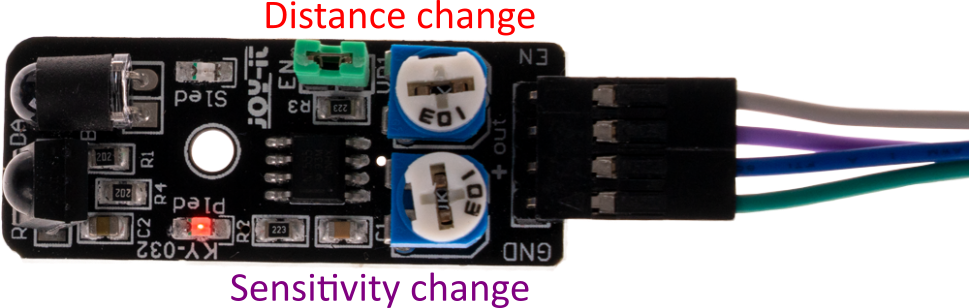 This obstacle detector uses infrared light to detect obstacles. When the emitted infrared light hits an obstacle, it is reflected and detected by a photodiode. The distance at which obstacles are detected can be set using two controllers. This module is particularly useful in control systems such as those used in robots to stop autonomously in front of obstacles. It enables reliable and precise detection of objects, allowing robots to navigate safely and avoid collisions. The easy adjustment of sensitivity makes the sensor versatile for various applications where obstacle detection is important.